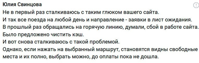 Пассажиры РЖД взволнованы: «На сайте постоянные глюки. Не находит ни одного билета на любое число: хоть на завтра, хоть через неделю. Везде висит "заявка в лист ожидания"».