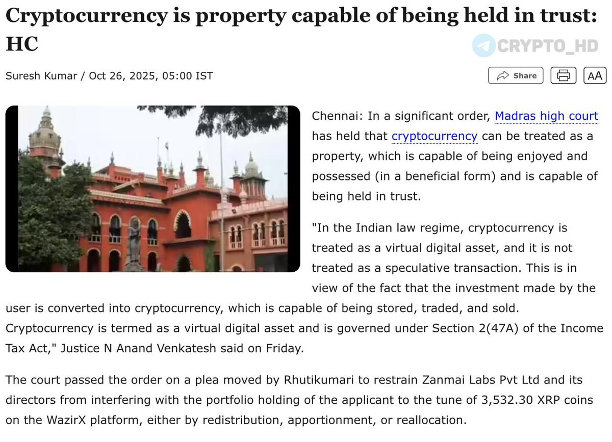 🇮🇳 Индийский суд официально признал криптовалюту формой собственности, которой можно владеть, распоряжаться и даже держать в доверительном управлении (trust). Это первое судебное признание в Индии, что криптовалюта – имущество, а не спекулятивный актив. Сryptо Headlines