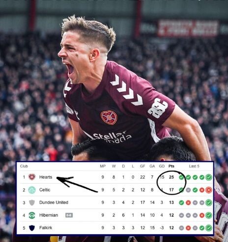 🏴 Удивительная таблица в Шотландии Хартс в последнем туре обыграл Селтик 3:1 и оторвался от "кельтов" на 8 очков! В последний раз в чемпионате Шотландии побеждал кто-то другой кроме Селтика и Рейнджерс - Абердин в сезоне 1984/85, когда их тренировал Алекс Фергюсон! Считаете, у Хартса есть шансы удержаться на первом месте до конца чемпионата? ⚽️ Подписывайтесь на нас в MAX