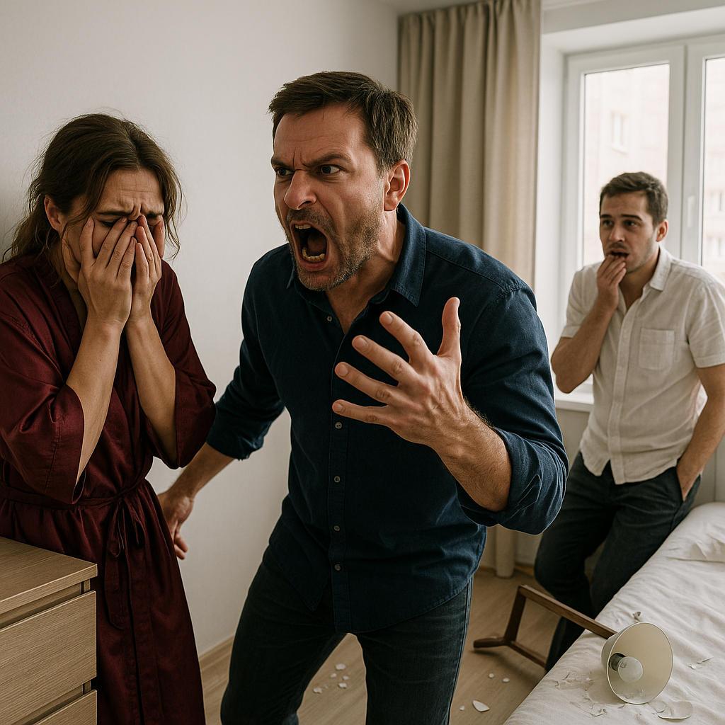 Артём стоял посреди спальни, тяжело дыша. Потом медленно обвёл взглядом комнату — разбитую лампу, перевёрнутый стул, её халат, валяющийся клочьями у кровати. И вдруг развернулся, вышел.