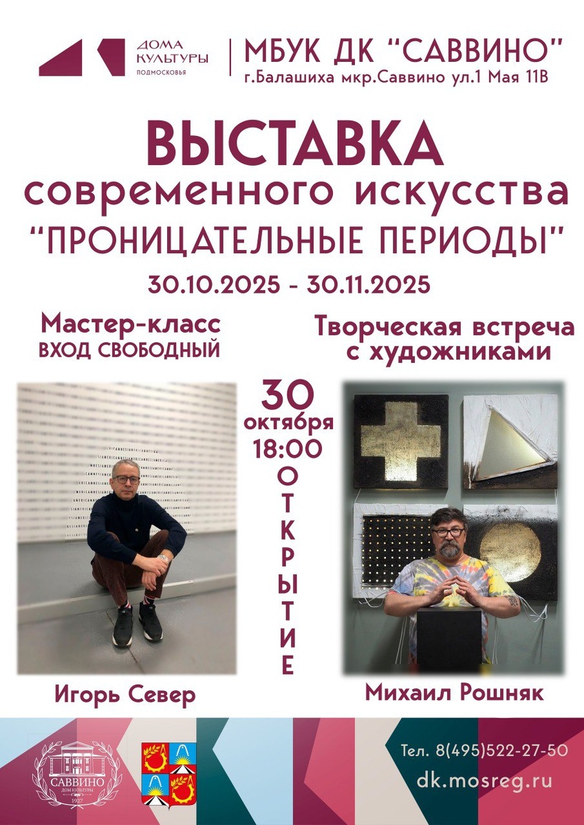 Дом культуры «Саввино» приглашает вас на яркие мероприятия! ✨ 📅 30 октября в 18:00 — выставка современного искусства «Проницательные периоды». Что вас ждёт: ✅ уникальная выставка с работами талантливых художников; ✅ мастер-класс; ✅ творческая встреча с художниками. 🔹 Игорь Север (г. Москва) — член Творческого союза художников России (ТСХР); 🔹 Михаил Рошняк — художник, перформансист и куратор. Участвует в российских и зарубежных выставках и перформансах с 1987 года. ВХОД СВОБОДНЫЙ! 🔔 А ещё мы подготовили для вас самое фееричное событие осени — «Народная хороводная Ночь искусств»! 📅 2 ноября в 19:00 окунитесь в атмосферу творчества и веселья: 🔹 интерактивные фотозоны; 🔹 увлекательная игровая программа; 🔹 дискотека; 🔹 мастер-классы; 🔹 аквагрим; 🔹 всё это — в темноте с УФ-освещением! Стоимость входа — 150 рублей. Мастер-классы — по отдельной записи. 📲 Купить билеты можно по ссылке: https://biletof.com/choose/?ra=17287&elem=0&var=2&frame=1