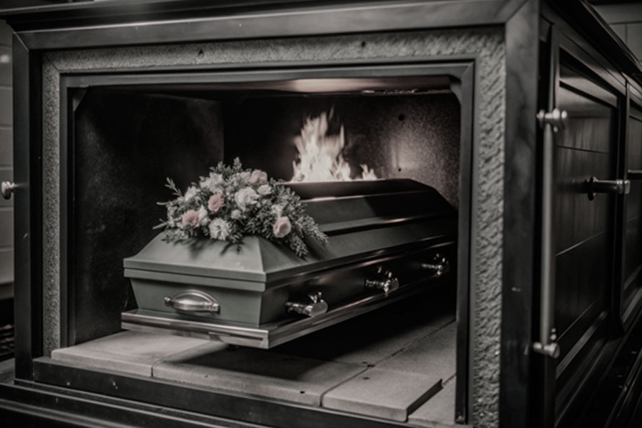 При кремации используются и ритуальные принадлежности: гроб и убранство в него, урна для праха, погребальный текстиль, цветочные композиции, религиозная атрибутика, временное надгробие или мемориальная табличка.