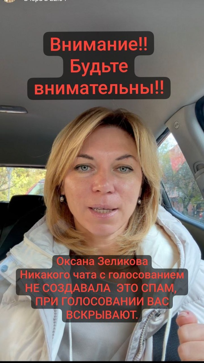 Внимание!! Внимание:. Оксана Зеликова Никакого чата с голосованием НЕ СОЗДАВАЛА ЭТО СПАМ, ПРИ ГОЛОСОВАНИИ ВАС ВСКРЫВАЮТ Будьте внимательны!!!! Перекиньте это сообщение своим коллегам