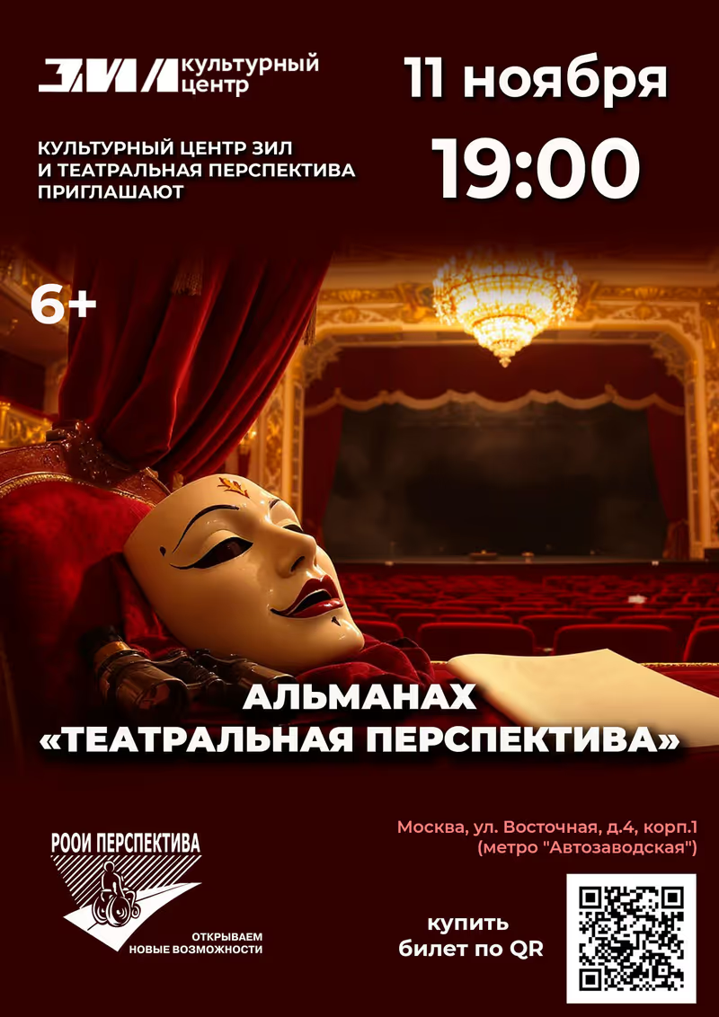 Региональная общественная организация инвалидов «Перспектива» в рамках инклюзивного проекта «Театральная перспектива» приглашает 11 ноября в Культурный Центр ЗИЛ на показ альманаха из четырёх новых пьес.