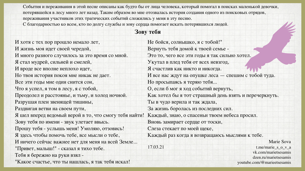 C благодарностью ко всем, кто по долгу службы и зову сердца помогает искать потерявшихся людей. "Зову тебя" И хотя с тех пор прошло немало лет,
