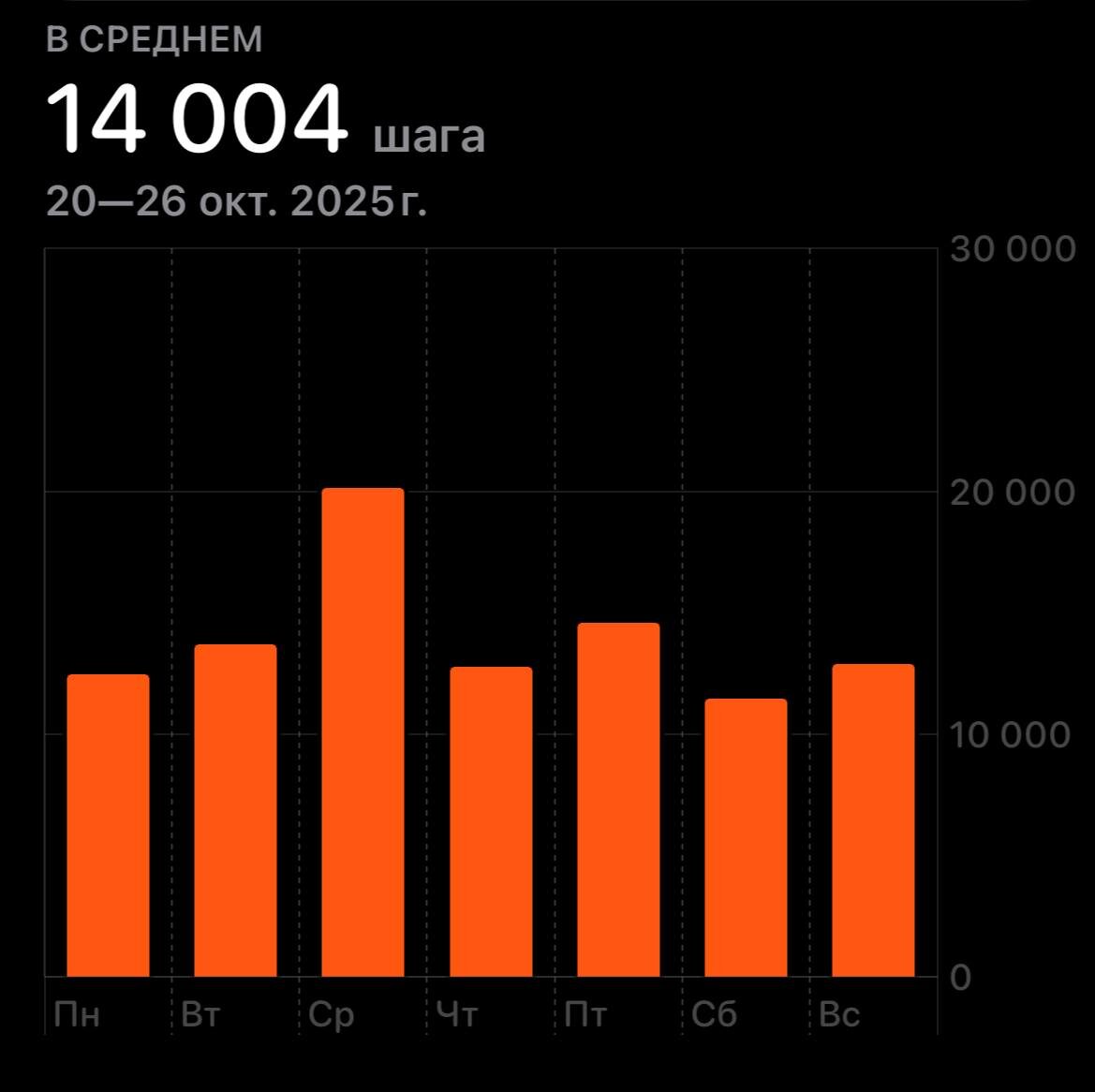 🏃 АКТИВНОСТЬ + ПИТАНИЕ 🍽️ ✅ Итак, фиксирую результаты с 20 по 26 октября. 🚶 Активность в виде шагов смог выдержать в размере 14 тысяч в сутки. Чуть побольше, чем планировал, изначально таргет был 11 тысяч. 🎯 Цель на эту неделю также, не ниже 11 тысяч шагов в сутки. 🍱 Питание, тут была цель: Б - 190 Ж - 75 У - 285 Вышло: Б - 177, чуть снизил, позже объясню, почему. Ж - 79, тут непроизвольно сделал выше, из-за снижения белка. У - 276, тут всё чётко. 🎯 На эту неделю план: Б - 185 Ж - 72 У - 275 📌Взвешивание будет в пятницу ⁉️ Следите ли вы за своим питанием и расходом энергии?