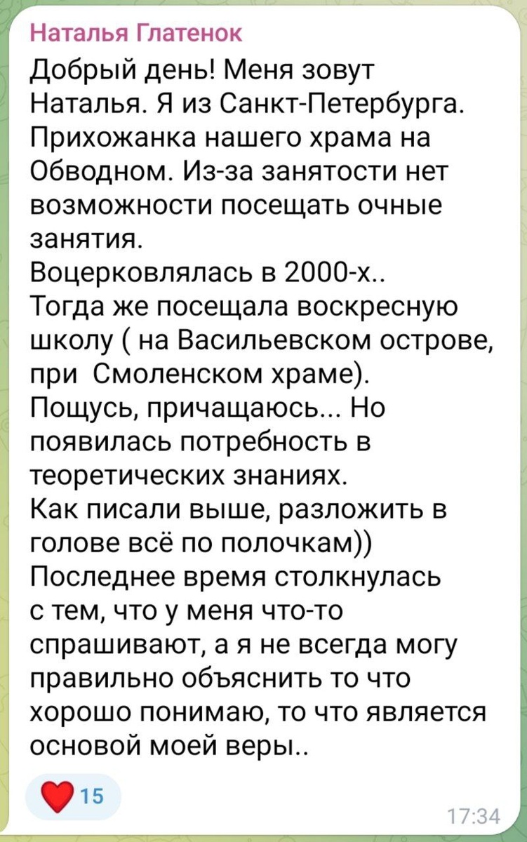Курс «Дитя Бога» начался 🌿 306 человек уже присоединились к приходу храма Воскресения Христова у Варшавского вокзала. Кто-то пришёл, потому что "молиться не умею". Кто-то — потому что давно хотел "научиться любить Бога и людей". Кто-то — "разложить все по полочкам". Все — чтобы помочь храму собрать на окна. Впереди — восемь недель лекций, вебинаров и реальных историй. Уже читали и разбирали Евангелие с о. Алексием. Завтра — первый прямой эфир. Что будет ещё: 🎙 Лекции и уроки. О Новом Завете, таинствах, молитве, приходской жизни. Часть уже записана, а часть рождается в ответ на комментарии участников. Потому что вера — это не доказательство теоремы. Это опыт общения с Богом разных людей. 👉 Мини-консультации — личные созвоны с одним из ведущим на 20-25 минут, когда вы можете задать свой вопрос. Запись остаётся только в закрытом канале курса, никуда больше не выкладывается. После такой консультации участница прошлого потока Алена решилась на переезд из Сибири в Москву — впервые за