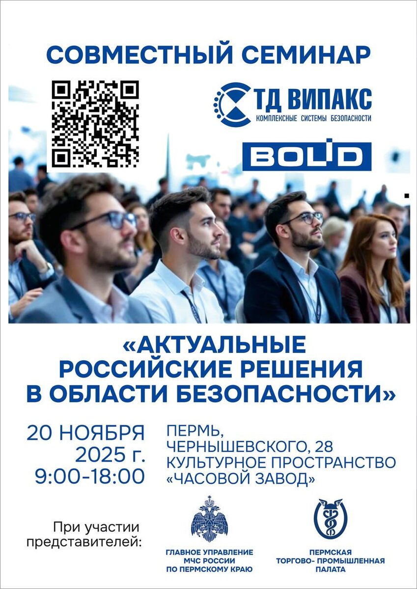 📢 Приглашаем на семинар ТД ВИПАКС и ЗАО «Болид» «Актуальные российские решения в области безопасности» 20 ноября 2025 года в Перми, в культурном пространстве «Часовой завод» (ул. Чернышевского, 28), состоится совместный семинар Торгового дома ВИПАКС и стратегического партнёра — компании ЗАО «Болид». Мероприятие объединит производителей, экспертов, специалистов, инженеров, руководителей промышленных предприятий и представителей государственных структур, чтобы обсудить современные технологии безопасности. В программе семинара: 🔺Тренды цифровизации и интеллектуального видеонаблюдения от эксперта ВИПАКС. 🔺Доклады компании «Болид» об изменениях в пожарных нормах и новых технологиях автоматизации. 🔺Выступление спикера ГУ МЧС России по Пермскому краю. 🔺Выступление спикера Пермской торгово-промышленной палаты. 🔺Кейсы, которые помогут выстроить эффективную и надежную систему безопасности. Участников ждёт не только насыщенная деловая программа, но и неформальное общение: ☕️кофе-брейки