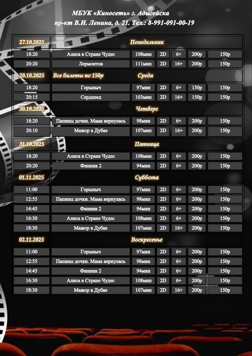 Расписание Кинозала г. Адыгейска с 27.10.2025 по 02.11.2025🎞 Купить билет онлайн можно по ссылке внизу 👇 https://clck.ru/32VTgE ___ Мы в социальных сетях👇 VK 🎞https://clck.ru/34TuU5 TG 🎞https://clck.ru/34TuU6 ОК 🎞https://clck.ru/3MdGRj 🎞WhatsApp: 8-991-091-00-19 📱8-991-091-00-19