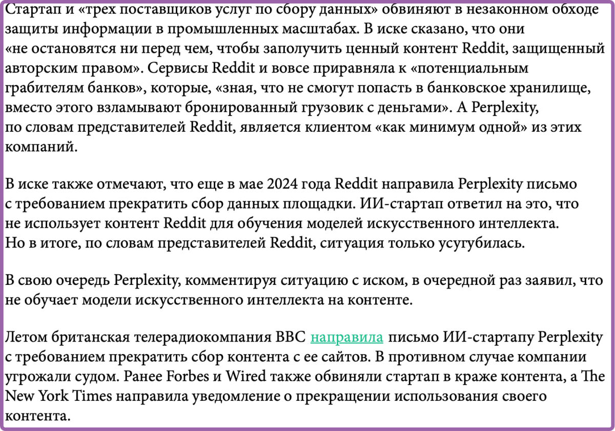 Мы тоже очень много парсим, сейчас до 2к сайтов в сутки. Но прикиньте, сколько данных собирают боты Perplexity, что на них подали в суд большие мальчики? Русский ИТ бизнес