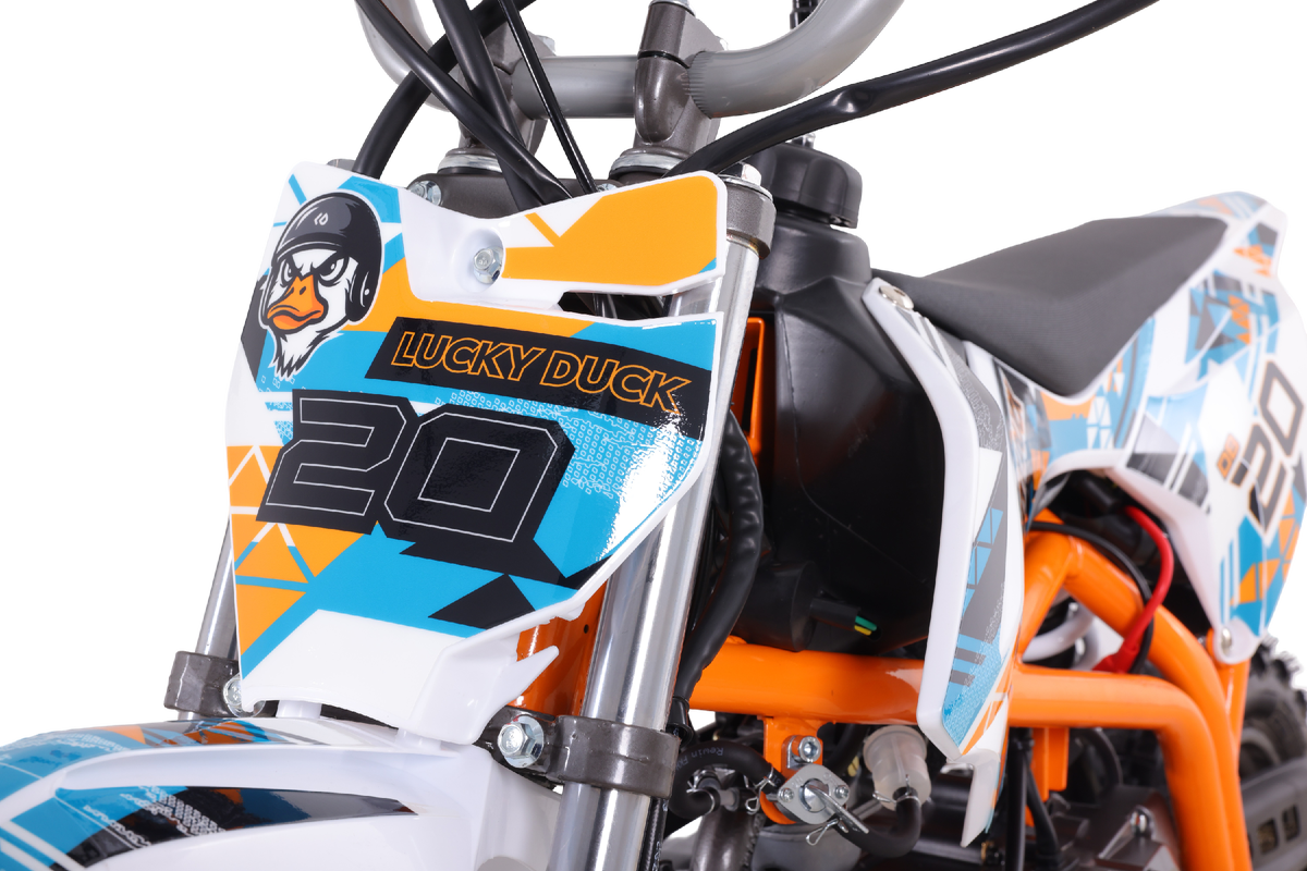 Часто бывает, что уже с малых лет по ребёнку можно сказать, что он точно захочет связать свою жизнь с мототехникой и мотоспортом. Именно для таких юных фанатов двухколёсной техники и создан новый Lucky Duck DB20 на колёсах 10/10 2025 года. В целом, внешний вид новинки 2025 года выглядит более привлекательным на фоне аналогичной техники. Модель очень эффектно выделяется своим ярким и агрессивным дизайном: изменённой формой пластика, более широким передним крылом, новой крутой и красочной графикой, которую, вне всяких сомнений, оценят юные райдеры. На мотоцикле установлен надёжный одноцилиндровый четырёхтактный двигатель воздушного охлаждения объёмом 110 см3, который выдаёт 4.7kw/8500 об/мин и максимальный крутящий момент 6,5 Нм/6500 об/мин, чего вполне достаточно для обучения и последующих прогулок по бездорожью. Система подачи топлива представлена карбюратором PZ19, который обеспечивает бесперебойную работу техники в самых жёстких условиях эксплуатации, простоту и лёгкость в обслуживан
