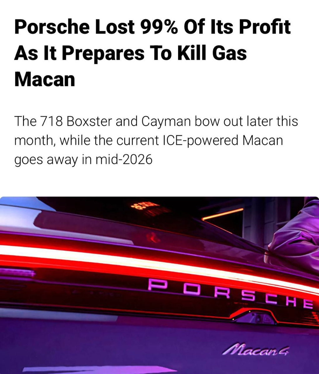 Porsche на грани исчезновения. За 2025 год прибыль компании рухнула на 99%, с €4 млрд до €40 млн. Обвал вызван сразу множеством факторов: запуском электромобилей, которые оказались никому не нужны, отсутствием продаж в Китае из-за торговой войны Трампа и другими проблемами. Из-за кризиса производитель уже закрывает производство целого ряда моделей: купе Cayman, родстера Boxter и бензинового Macan. Хватаем себе пару Поршей пока не закрыт последний завод. Кстати из-за курса и отсутствия спроса цены на них в Китае ниже плинтуса.