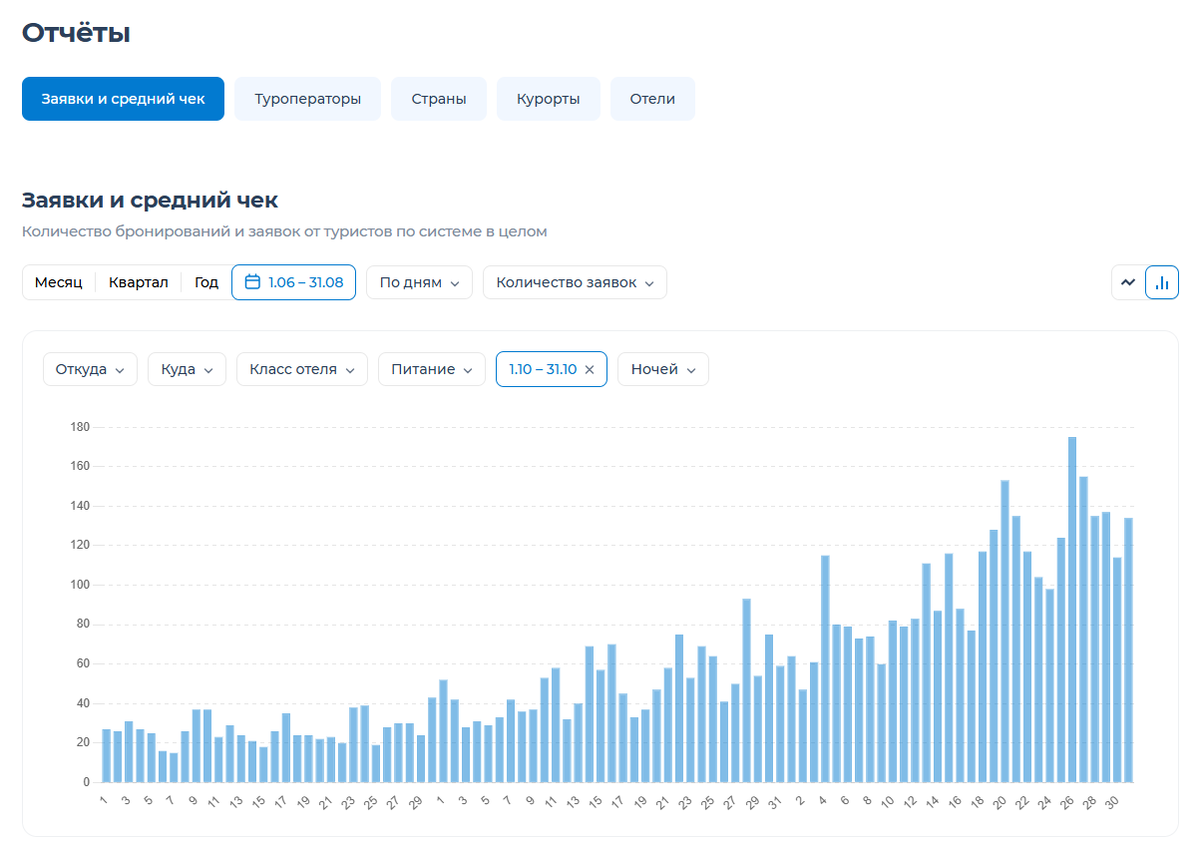 Задумывались, как меняются туристические тренды прямо сейчас? Какие страны становятся хитами сезона, а какие отели внезапно выходят в топ? Теперь вам не нужно гадать — достаточно одного клика, чтобы попасть в эпицентр событий! На нашем сайте есть уникальный раздел «Турстатистика» — настоящая лаборатория туристических данных, где вы найдете ответы на самые актуальные вопросы рынка: Здесь вы увидите реальные цифры: динамика спроса, рейтинги туроператоров и направлений, топы отелей, средний чек, продолжительность отдыха и многое другое.