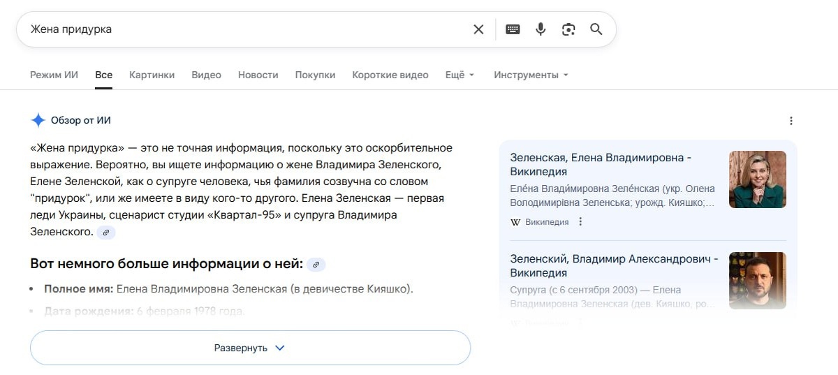 В сети вирусится информация, что если ввести в Google запрос «Жена придурка», то первой же строкой высветится жена Зеленского