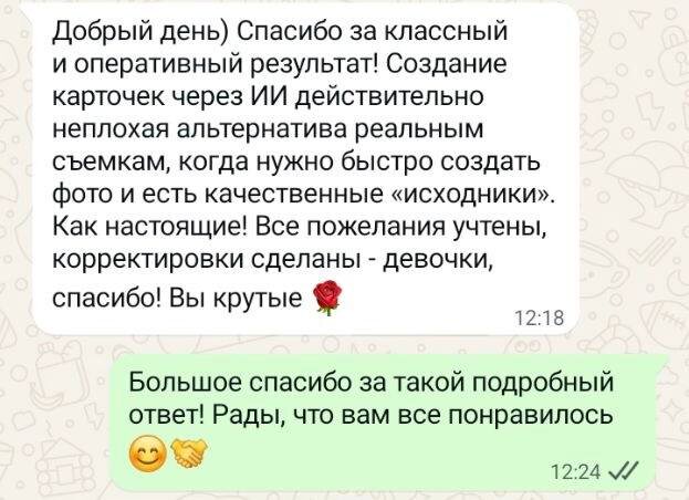 Да, нейросети уже делают карточки. И да — по ним уже летят отзывы. 📌 Кто-то думал, что это “игрушка”. 📌 Кто-то — что это “костыль”. 📌 А кто-то уже тестит гипотезы и получает рост CTR без съёмок и ожидания 2 недель. ИИ-карточка — это не замена продакшну. Это инструмент, когда нужно: — протестировать гипотезу на старте, — запустить артикул с минимальными затратами, — или сделать визуал, когда в ассортименте всего 1–2 товара. И это всё за 72 часа. Без аренды студии. Без поиска модели. Без “пока всё утвердят”. Это не магия. Это быстрый способ зайти в сезон — и понять, куда двигаться. 👉 Хочешь так же? Забирай ИИ-карточку: https://t.me/upakovano_online Сейчас — 6000 руб/арт. Потом будет дороже. И не факт что будет слот.