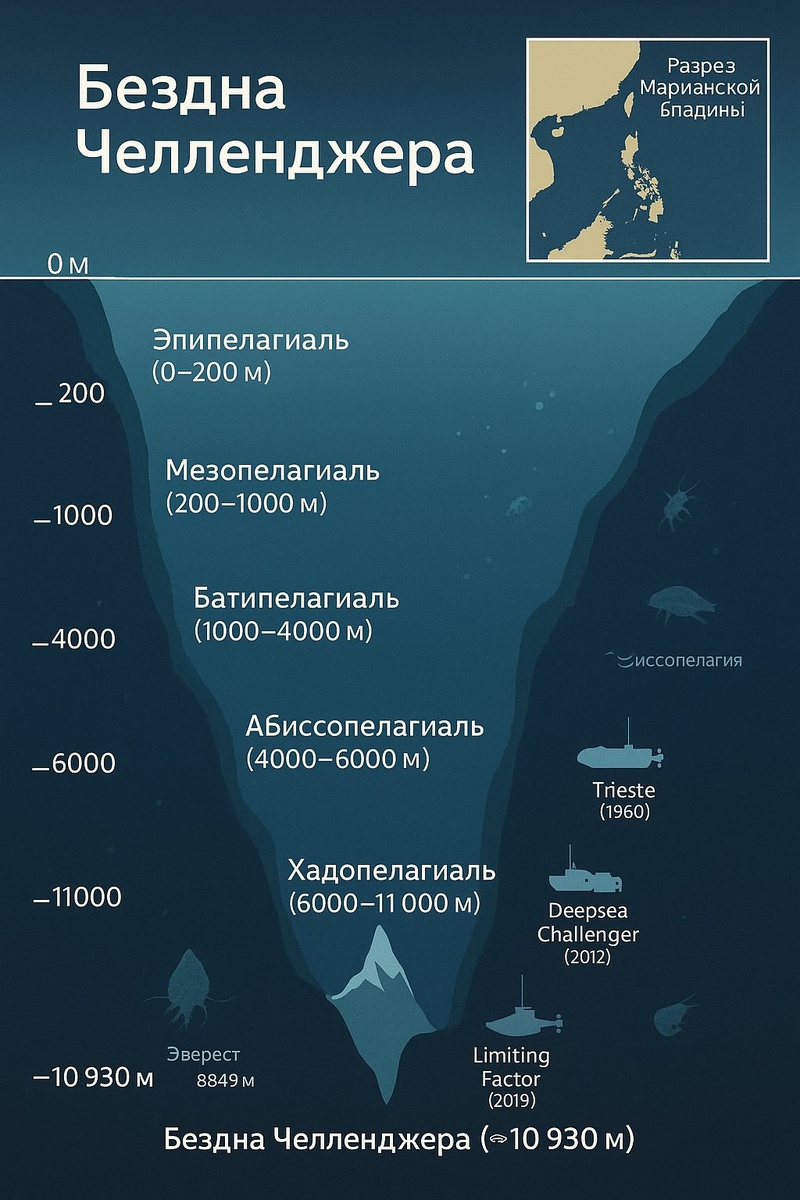 Самая глубокая точка на планете — Бездна Челленджера — уходит под воду почти на 11 000 метров.