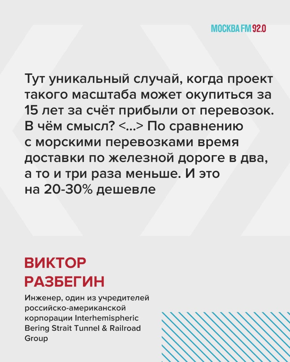 В ответ на пост 🚇 Тоннель между Россией и США ненамного сложнее, чем Лефортовский в Москве Об этом заявил инженер и участник первой конференции по проекту трансконтинентального тоннеля, которая прошла в 1993 году в Вашингтоне, Виктор Разбегин. Обойдётся тоннель в сумму от 8 до 10 млрд долларов, рассказал инженер изданию «КП»: А если прибавить железнодорожную магистраль, которая соединит нашу сеть с американской, — 60-65 млрд. У нас недостающий участок железной дороги — примерно 4 тысячи километров от Якутска до мыса Уэлен на Чукотке. <...> Такая магистраль — революционный маршрут, который свяжет не просто Россию и США, а страны Азиатско-Тихоокеанского региона, Южной и Северо-Восточной Азии — Китай, Корею, Индию, Японию — с Северной Америкой через Аляску и Канаду. 📌 Подписаться на Москва FM / Наш чат-бот / Мы в MAX