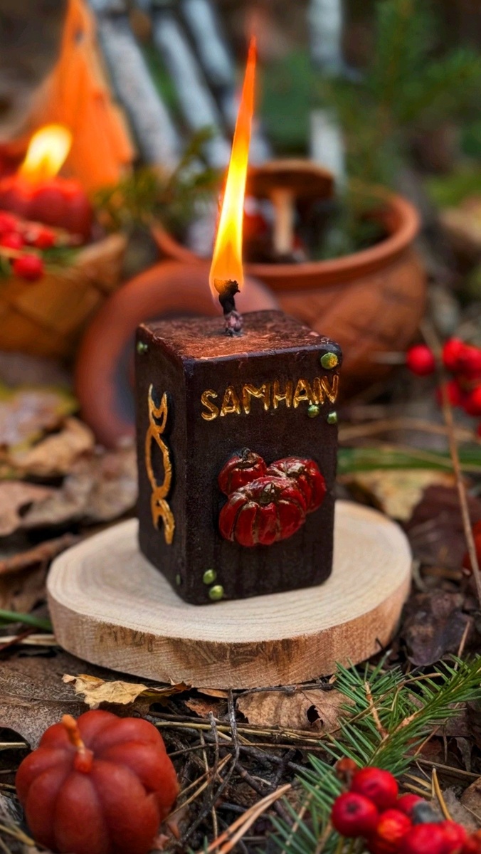 В Самайн мы прощаемся со всем, что мешает нам жить счастливо. Предлагаю простой обряд для избавления от вредных привычек, болячек и всего ненужного. Возьмите три тонкие свечи, не окрашенные. Иглой напишите на каждой то, от чего хотите избавится. Одна свеча - одно слово. Например - Болезнь. Страх. Безденежье. Растолките в ступке полынь, шалфей и мяту. Обкатайте свечи. Сделайте скрутку косичкой. Когда плетёте говорите: Косицу плету, в неё (что написано на свечах) вплетаю, впечатываю. От себя убираю, в воск добавляю. Все сказанное к воску прилепляется, тело и дух мой от бед избавляется. В ночь с 31 октября на 1 ноября зажечь свечи со словами: Что в свечу с меня забрано, впечатано, С воском тает, в огне сгорает. Как я сказал/а, так тому и быть. Истинно. Во время прогораете свечей визуально представить как сгорает все плохое. Я всегда свечи мажу своей кровью, но это по желанию. Свечи можно установить в соль. Когда скрутка сгорит, осторожно перчатками взять огарки
