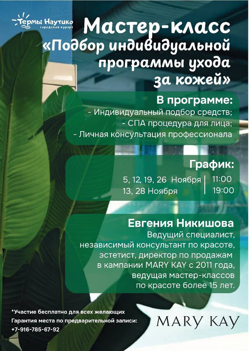 План на ноябрь — стать неотразимой 🌟. Что для этого нужно? ✅ Прийти в Термы «Наутико». ✅ Получить бесплатную СПА-процедуру для лица. ✅ Узнать все секреты своей кожи от профи. ✅ Уйти красивой и с идеальной программой ухода, которая подходит именно вам.✨ Всё это — на нашем бесплатном мастер-классе!🌷 👉Выбирайте удобный день (5, 12, 13, 19, 26, 28 ноября) и время (11:00 или 19:00). ❗️Внимание: бесплатное СПА вызывает привыкание и восторг. Бронируйте место, пока есть: 📞+7-916-785-67-92 Термы «Наутико» г. Мытищи, ул. Летная, стр.19