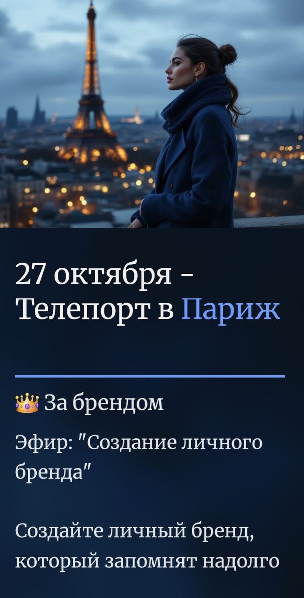 3 мифа о личном бренде, в которые до сих пор верят даже умные люди. Миф №1: «Личный бренд — это фоточки и тексты про себя» Нет. Это система, благодаря которой Вас ищут, цитируют, зовут и покупают. Даже если Вы молчите. Миф №2: «Мне не нужен бренд, я не инфобизнес» На самом деле, бренд нужен именно Вам, если Вы: — работаете в профессии, — развиваете экспертность, — строите компанию, — хотите расти в цене и влиянии. Потому что у кого нет бренда — того нет на рынке. Миф №3: «Я пока не готов(а) показываться» А Вы не обязаны. Личный бренд — это не про показ. Это про позицию, ценность, смысл и репутацию, которую можно строить даже в тени — с умом и стратегией. ⸻ 📍 В 19:00 — телепорт в Париж 🥐 Лекция: Как создать личный бренд, который станет Вашим капиталом на годы вперёд. Без воды. Без самолюбования. Чётко, стратегично, с разбором. Это та самая лекция, после которой Вы начнёте говорить о себе так, что слушать — будут не из вежливости, а потому что Вы стали интересны рынку. ⬇️⬇️⬇️ Сс