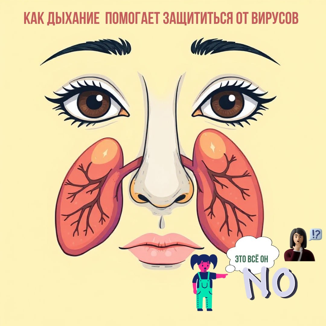🍁Осень – это время, когда иммунитет нуждается в поддержке. Мы больше бываем в помещениях, воздух становится суше, а вирусов вокруг - всё больше. Кто-то пьёт витамины, кто-то закаливается, кто-то просто надеется, что обойдётся. Но мало кто знает, что у нас уже есть встроенный антивирусный механизм - дыхание через нос. Да, всё настолько просто. Когда вы вдыхаете носом, слизистая не просто фильтрует и согревает воздух — она вырабатывает оксид азота (NO). Это маленькая молекула с большими возможностями: она убивает вирусы, подавляет рост бактерий, расширяет сосуды и улучшает поступление кислорода в ткани. 🔬 Исследования показывают, что именно оксид азота помогает организму быстрее справляться с вирусными инфекциями, включая респираторные. Но есть нюанс. NO выделяется только при дыхании через нос. Стоит начать дышать ртом и этот природный барьер перестаёт работать. Поэтому привычка дышать носом - это не просто эстетика, а базовый навык здоровья. Чтобы усилить выработку оксида азота, поп