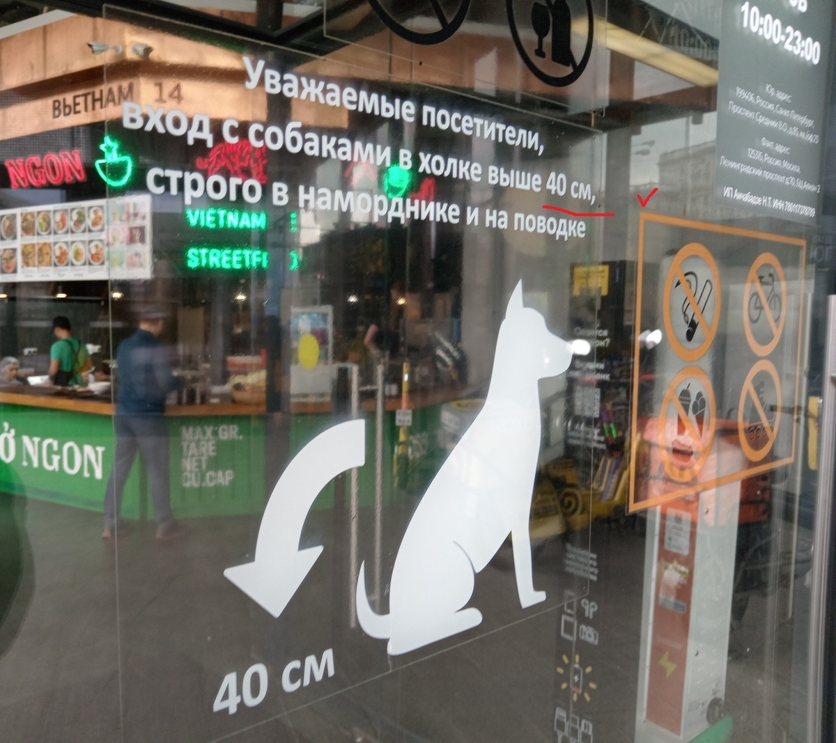 Это обычное бытовое объявление способно вызвать у внимательного читателя взрыв смеха. А что, собственно, тут смешного? Вчитаемся: «Уважаемые посетители, вход с собаками в холке выше 40 см, строго в наморднике и на поводке». К кому обращается автор объявления? К посетителям заведения (это фудхолл возле станции метро «Сокол» на Ленинградском проспекте в Москве). А дальше сказано, что при входе с крупной собакой должен быть в наморднике и на поводке… Вот только кто? Пёс или хозяин? Получается, что хозяин! Ведь именно к нему направлено обращение. Хозяин здесь является субъектом и действующим лицом, осуществляя в заведение «вход с собаками». В результате в воображении рисуется комичная карикатурная картинка. Также во фразе «в холке выше 40 см» присутствует нежелательная инверсия, перестановка слов местами. Это делает словосочетание корявым и неуклюжим. Правильно будет написать «выше 40 см в холке». Переделать это объявление, чтобы оно не звучало нелепо, не так просто, как кажется. Попробуем