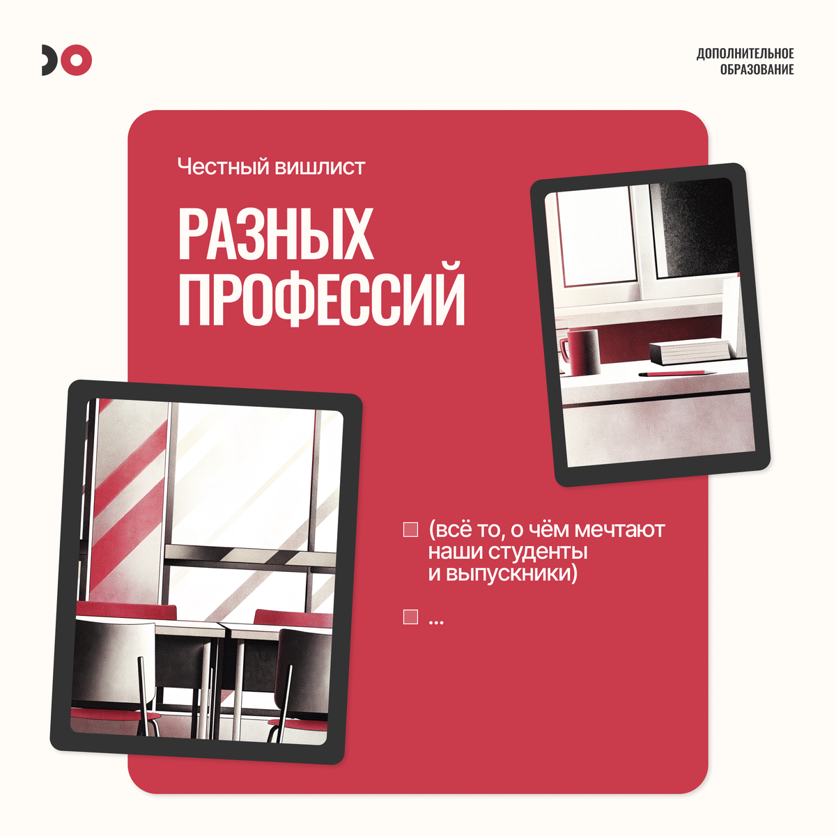 У каждой профессии — свои маленькие мечты. Не про деньги и должности, а про искренние «хочу», которые делают работу любимым делом. Мы собрали честные вишлисты творческих специалистов — дизайнеров, художников, конструкторов и многих других. То, о чём обычно не говорят вслух, но что на самом деле важно каждому из нас ❤️ Листайте карточки и узнайте, какие желания объединяют всех, кто любит своё дело. Вдохновляйтесь на новое обучение вместе с Дополнительным образованием Университета Косыгниа 💫
