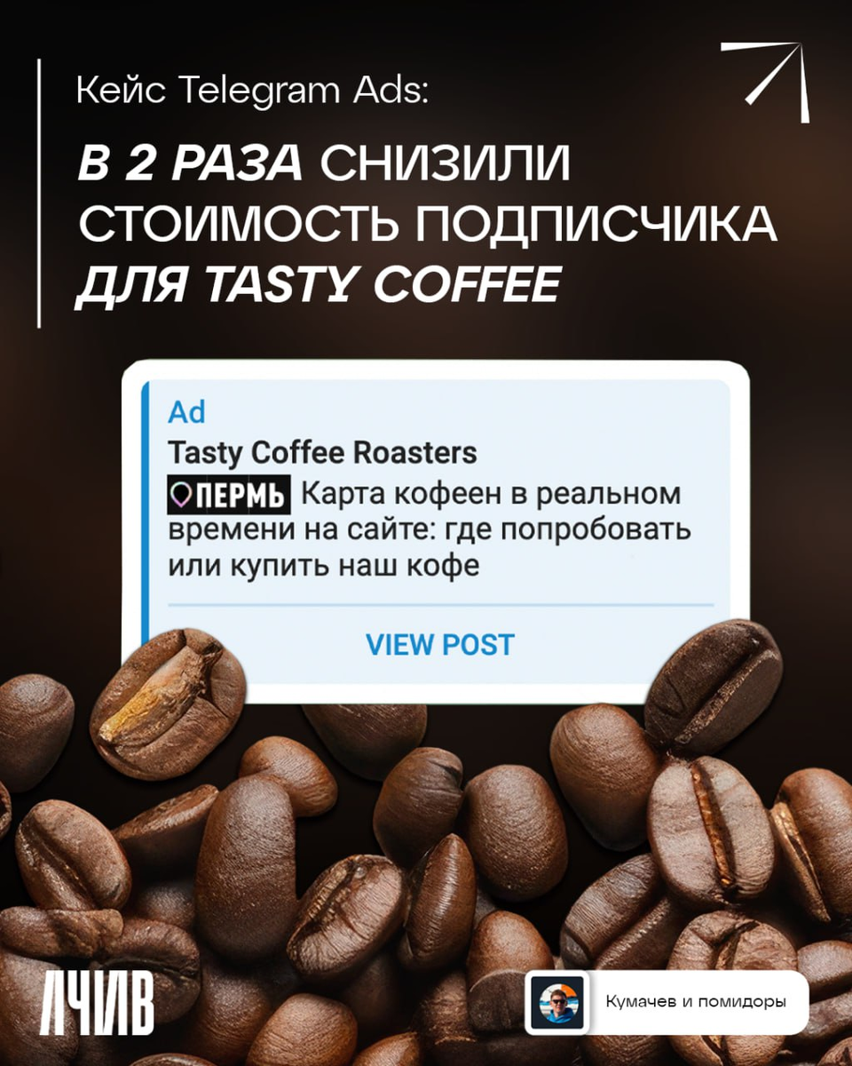 Как фича на сайте Tasty Coffee помогла удешевить подписчика из Telegram Ads в 2 раза Однажды маркетинговый отдел классных обжарщиков из Ижевска задумался: а что, если на карте страны отметить каждую кофейню, где варят кофе на их зерне? Так появился интерактивный раздел «Где попробовать». Мы решили протестировать связку: таргетинг на город пользователя + персонализированная локализация, чтобы показать, где рядом можно попробовать кофе и купить пачку. Добавили кастомные эмодзи с названиями городов в объявления и направили трафик на пост: t.me/roastedinizhevsk/4848 Результат: стоимость подписчика уменьшилась в 2 раза, в сравнении со средним показателем рекламного кабинета. Вывод: даже в таких простых инструментах, как Telegram Ads, нестандартные методики могут давать сильный эффект. Экспериментируйте!
