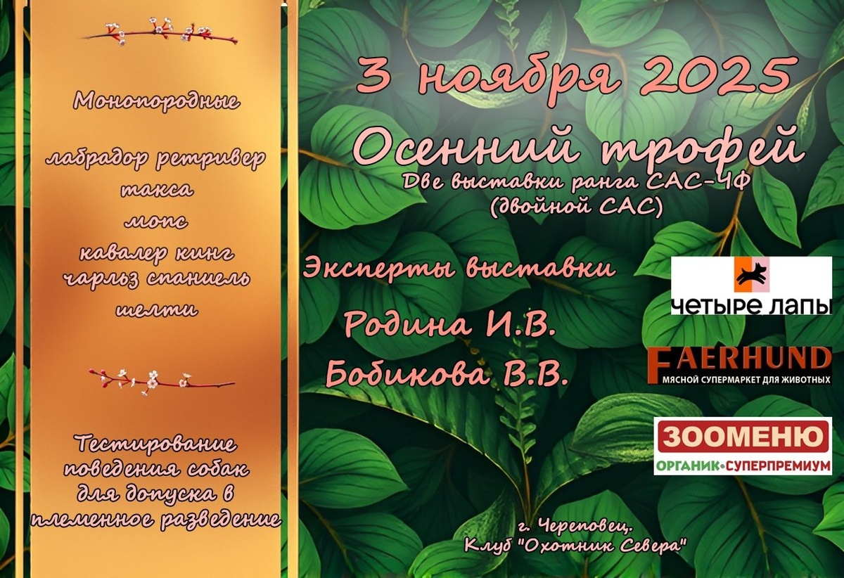 ⏰ 3 ноя (7д) 🏛 #Череповец #Вологда #Россия #Выставка 🐶 Выставка собак: КСОС Охотник Севера 🏆 Клуб спортивного и охотничьего собаководства "Охотник Севера" Контакты организаторов здесь: 🌐 https://www.petsman.ru/vystavki-sobak.php?mesto=127-cherepovets 2 х САС (ЧФ РФОС+ЧФ РФОС) + МОНО Мопс, Такса, Шелти, Лабрадор ретривер, Кавалер Кинг Чарльз Спаниель + ТЕСТИРОВАНИЕ ПОВЕДЕНИЯ МОНО Такса, Лабрадор Ретривер, Шелти МОНО Мопс, Кавалер Кинг Чарльз Спаниель 🧑 👨 Эксперты: 🔹 Валерия Бобикова