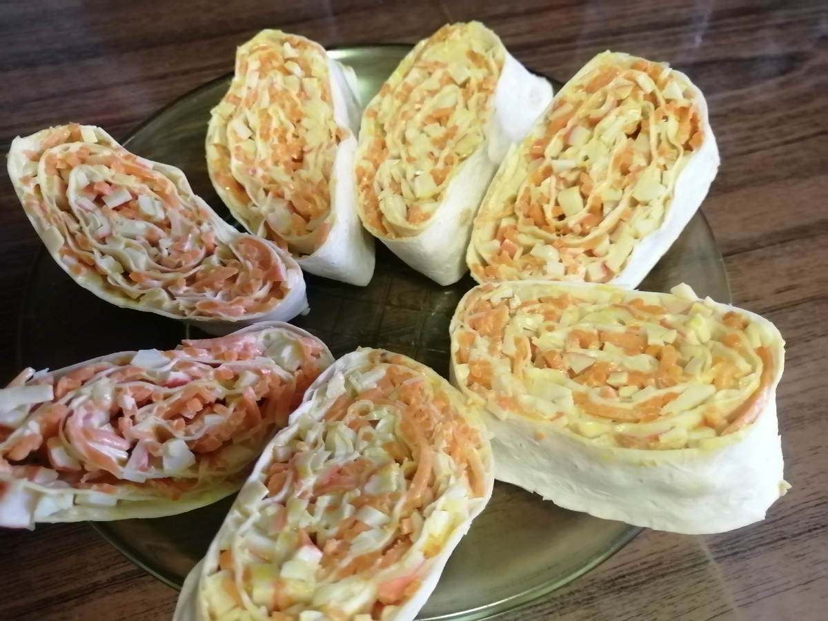 Здравствуйте, мои дорогие! Готовила рулет из лаваша и решила поделиться вами. Очень вкусно получилось. Для приготовления нам понадобится :лаваш, морковь по корейски, крабовые палочки, майонез. Крабовые палочки нарезать мелко или натереть на терке, добавить морковь и немного майонеза Лист лаваша смазать майонезом и разложить начинку. Свернуть рулет, положить в пакет и в холодильник на час, для пропитки. Вкусный рулет, готов. Очень вкусно! Готовьте на здоровье!