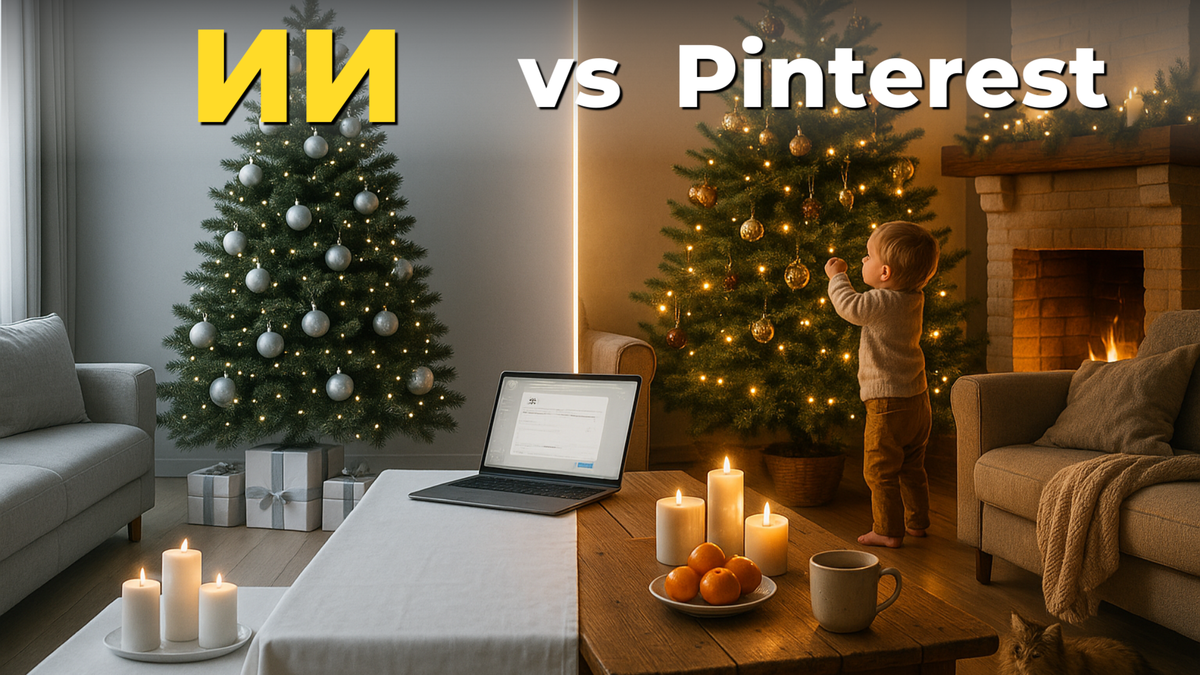 Перед Новым годом Pinterest традиционно становится главным источником вдохновения. Тысячи подборок с уютными ёлками, сервировкой и оформлением подарков. Теперь у него появился конкурент - искусственный интеллект. Нейросети: Midjourney, ChatGPT, Kandinsky и другие уже умеют создавать интерьерные картинки по описанию. Я решила сравнить: кто предложит лучший праздничный декор - реальные люди или нейросеть. 1. Ёлка Pinterest: неидеальные, но тёплые кадры. Елка стоит немного криво, игрушки разные, гирлянда не по линеечке - зато уютно и по-родному. ИИ: генерирует безупречную симметрию. Игрушки как из шоурума, гирлянды лежат математически точно. Красиво, но слишком “чисто”, без живого тепла. Вывод: ИИ - для визуалов и перфекционистов, Pinterest - для тех, кто ценит атмосферу. 2. Новогодний декор ИИ: мгновенно подбирает цвета по психологии восприятия: золото с кремовым, серебро с лавандовым, изумруд с бежем. Может рассчитать, какой свет лучше подчеркнёт интерьер, и даже подсказать пропорции