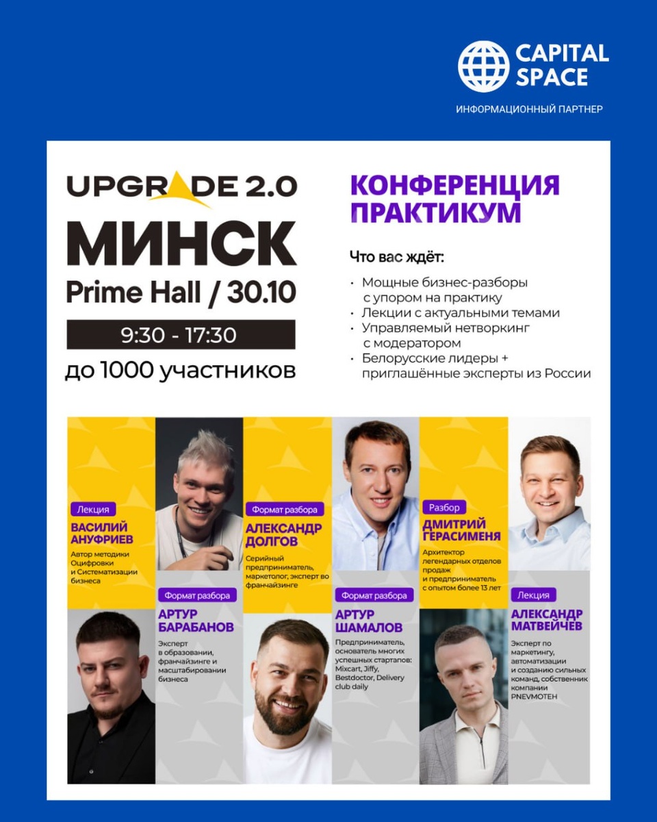 📅 30 октября | Минск, Prime Hall | до 1 000 участников Время: 9.30 - 17.30 🚀 UPGRADE 2.0— следующий уровень. Это мощные бизнес-разборы, лекции по актуальным темам, управляемый нетворкинг и эксперты из Беларуси и России. Capital Space информационный партнер мероприятия 3 сильных эксперта, 2 бизнеса участников и разбор с разных сторон: Александр Долгов с точки зрения масштабирования, франчайзинга и системы Артур Шамалов - основной фокус внимания на мышлении предпринимателя. Если актуально, то международный бизнес Артур Барабанов - применимость инструментов на белорусском рынке и как создать успешный бизнес в Беларуси •Василий Ануфриев —основатель бренда El Viento, эксперт по систематизации и масштабированию бизнеса Тема выступления: «Как внедрить структуру в компанию, увеличить чистую прибыль и выйти из операционки» •Дмитрий Герасименя - Формат выступления: 45 минут разборов, где Дмитрий пригласит на сцену участников и в реальном времени проведет разбор продаж — звонок в компанию