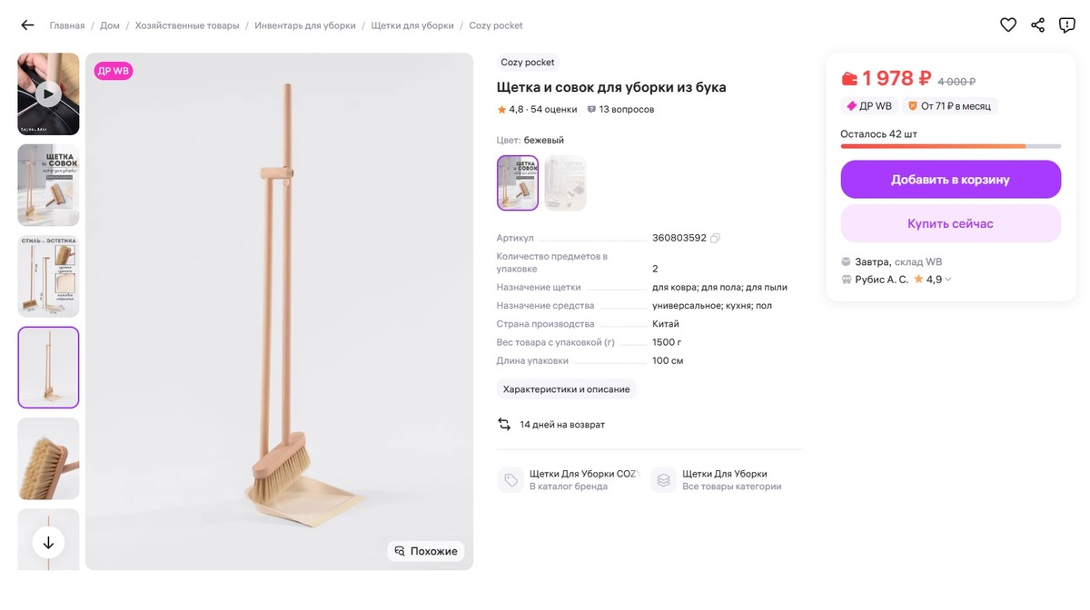 И вот несколько вещей, которые помогают мне сделать это без суеты и с удовольствием. Когда я впервые взяла в руки этот деревянный набор, вспомнила бабушкину кухню, у неё тоже всегда всё было чисто, но как-то по-доброму, по-домашнему. Щётка выметает даже то, что пылесос пропускает, а прорезиненный край совка плотно прилегает к полу - ни соринки не убежит. Дерево приятно держать в руках, и уборка превращается не в обязанность, а почти в ритуал. Артикул 360803592 Я люблю, когда даже кухонные мелочи радуют глаз. Эта щётка будто сошла со страниц Pinterest - лаконичная, с деревянной