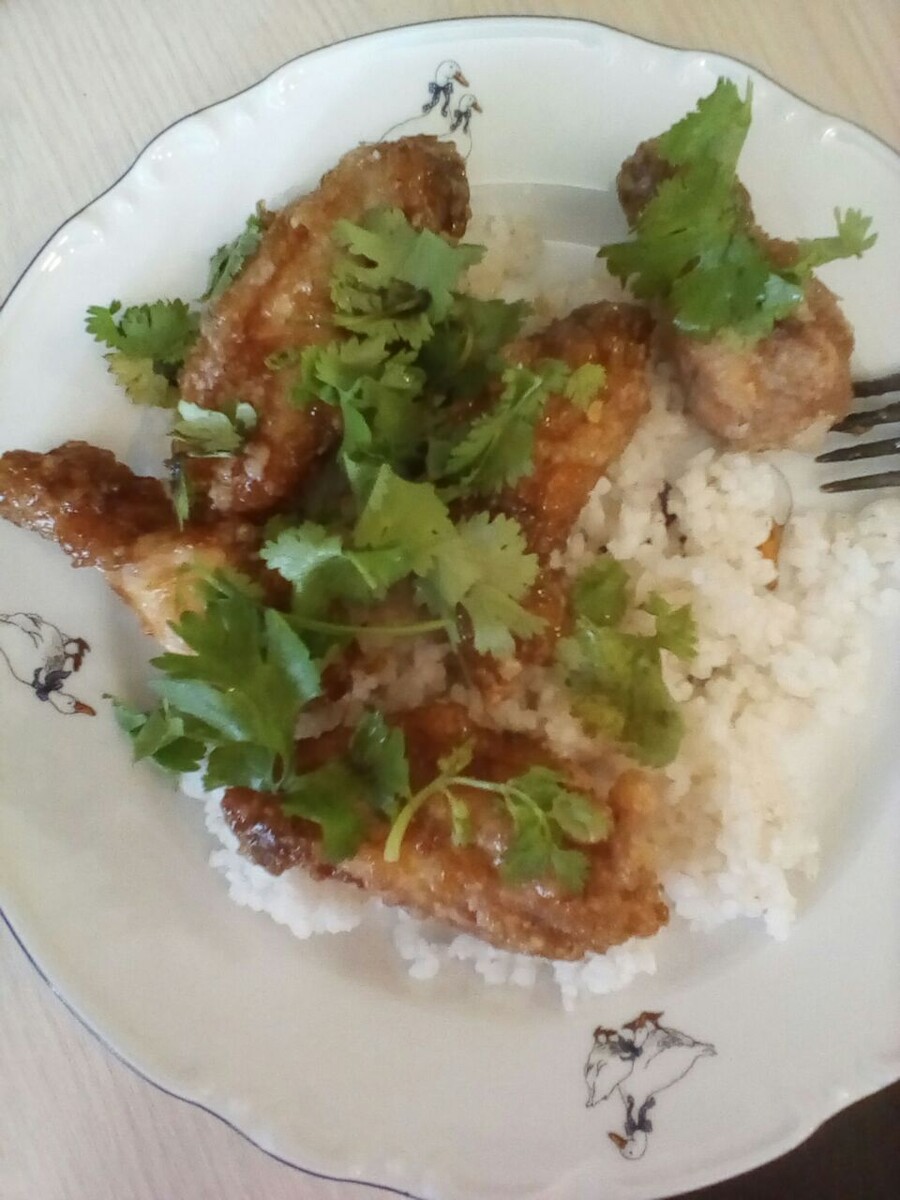 - Положите жареные крылышки в миску с соусом и перемешайте, чтобы они равномерно покрылись соусом. Затем выложите крылышки на большое блюдо, посыпьте сверху кинзой и сразу подавайте к столу (например, с рисом).