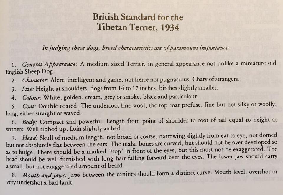 Стандарт породы 1934 года в Великобритании и несколько интересных фотографий— из книги Angela Mulliner's «Тибетский терьер». Британский стандарт тибетского терьера, 1934 При оценке этих собак породные характеристики имеют первостепенное значение. 1. Общий вид: Терьер среднего размера, внешне напоминающий миниатюрную староанглийскую овчарку. 2. Характер: Бдительный, умный и смелый, не агрессивный и не драчливый. С опаской относится к незнакомцам. 3. Размер: Высота в холке: кобели от 14 до 17 дюймов (35,56 до 43,18 см), суки немного меньше. 4. Окрас: Белый, золотистый, кремовый, серый или дымчатый, чёрный и пегий. 5. Шерсть: Двойной шерстный покров. Подшерсток тонкий и пушистый, верхний слой обильный, тонкий, но не шелковистый и не сильно волнистый, длинный, может быть как прямым, так и волнистым. 6. Корпус: Компактный и мощный. Длина от плеча до основания хвоста равна высоте в холке. Хорошо развитая грудная клетка. Поясница слегка выпуклая. 7. Голова: Череп средней длины, не