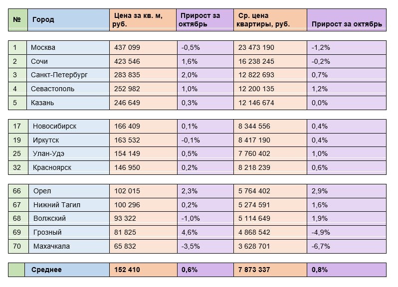 Средняя стоимость квадратного метра в новостройках Иркутска в октябре выросла на 0,4% – до 163,5 тыс