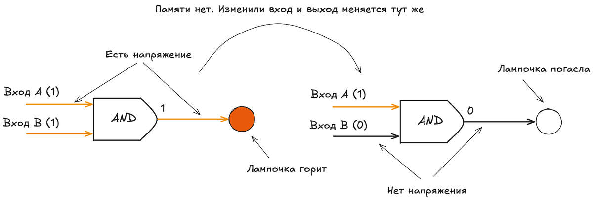 Триггер — это особая схема из логических элементов, которая впервые даёт компьютеру способность запоминать. Логические элементы, которые мы знаем, такие как «И», «ИЛИ» и «НЕ», работают мгновенно: вход изменился — выход тоже изменился. Но в них нет памяти, состояние исчезает, как только пропадает сигнал.