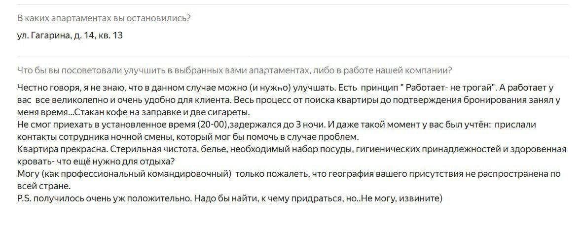«Кофе на заправке и две сигареты» - так описываем время, ушедшее на бронирование, гость компании "Две Подушки". На фото скрин его отзыва. Я помню, когда начинал бизнес в 2016 году, встречать гостей вживую - это была норма. В каждой квартире у нас лежали шаблоны предзаполненных договоров, в которые оставалось внести паспортные данные. Сейчас - это дистанционное заселение и оферты вместо договоров, моментально принимаемые сторонами. И такие изменения в каждой сфере бизнеса. В продажах - мы теперь не по телефону продаем, а переписываемся и в основном подтверждаем уже пришедшие бронирования. Раньше сдавалось все, а теперь гость стал более избирательным и в поисках уникальных и красивых мест. Я рад тому, что все вокруг стремится к росту и развитию. И готов следовать за этим.