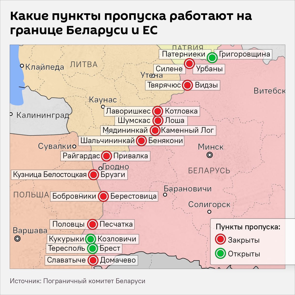 Какие пункты пропуска на границе Беларуси со странами ЕС работают на данный момент — смотрите в нашей инфографике