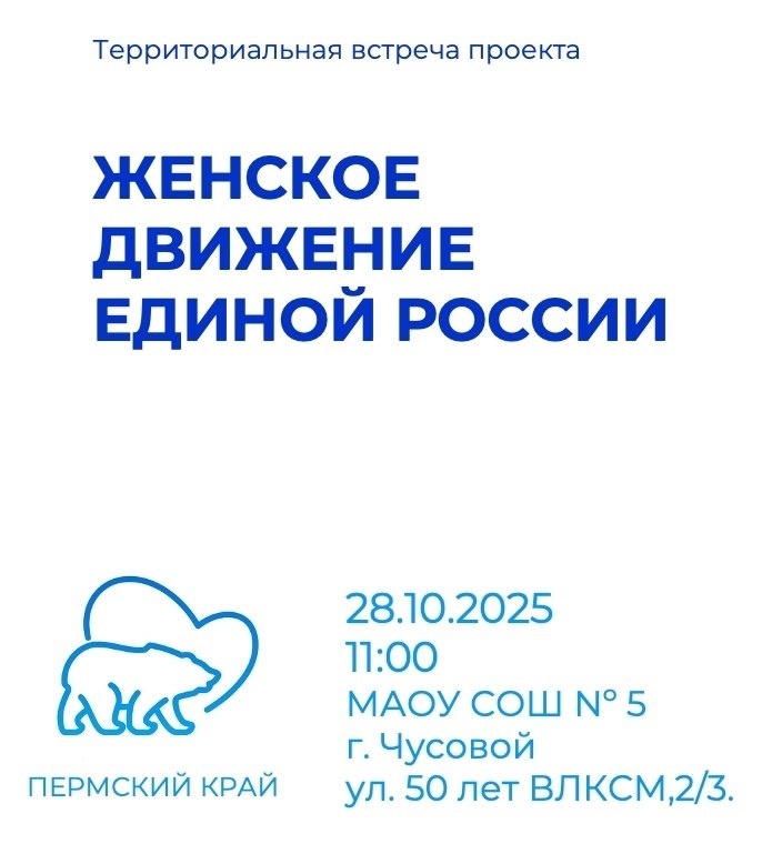 📍Территориальная встреча Женского движения в Чусовом 🗓️28 октября в 11.00 на площадке МАОУ СОШ Nº 5 (г. Чусовой, ул. 50 лет ВЛКСМ,2/3) в рамках реализации проекта «Женское движение Единой России» пройдет большая встреча женщин-лидеров, женщин - предпринимателей, общественных деятелей, лидеров общественного мнения, мам подростков, семей участников СВО, активных участниц Женского движения. 📈Насыщенная интересная программа, тематические площадки, региональные эксперты, теплая атмосфера, общение - все это ждет вас, дорогие женщины! ✅Присоединяйтесь! ⏩️Участие бесплатно! Доступна онлайн - регистрация: https://vk.com/away.php?to=https%3A%2F%2Fforms.gle%2FQQNCV79F8QLyL1TX8&utf=1 👇🏻Полная программа мероприятия доступна в приложении к посту. #ЖенскоеДвижение_ПермскийКрай