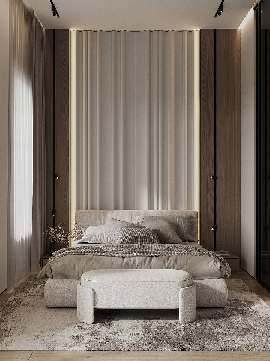 Тёплое дерево и пастельные оттенки, мягкий свет, ненавязчивый, но характерный декор. Гардеробная за дверями из тонированного стекла будто готовится к съёмке для журнала: идеальный порядок, ровные линии, игра света.
