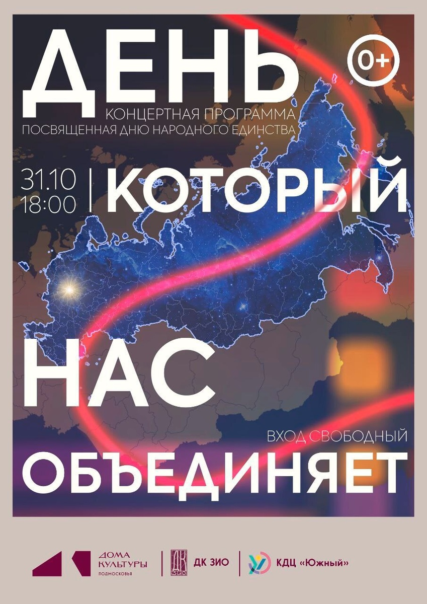 🇷🇺 Концертная программа «День, который нас объединяет» 📅 31 октября в 18:00 📍 Г.о. Подольск, ул. Мира 4, Дом культуры ЗИО 🎫 Вход свободный Возрастное ограничение: 0+ Приглашаем в удивительное путешествие по просторам нашей необъятной Родины! От Златоглавой Москвы до края вулканов - Камчатки, от Кавказский гор до диких Северных Морей, от крупных городов до маленьких уютных деревень. Наследие России многообразно, ее красота таится в каждом уголке нашей родной земли, в каждой улыбке ее жителя, а нам предстоит с особой теплотой окунуться в многокультурный быт нашей любимой России, в День народного единства - день который нас объединяет. 🤝 Ждем всех, кто хочет стать частью этого праздника. #ДКЗИО #ДеньНародногоЕдинства #Концерт #Подольск #Культура #ВходСвободный