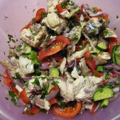 · Осторожнее с солью! Обязательно пробуйте салат перед тем, как солить, так как скумбрия и огурцы уже дают достаточную соленость.