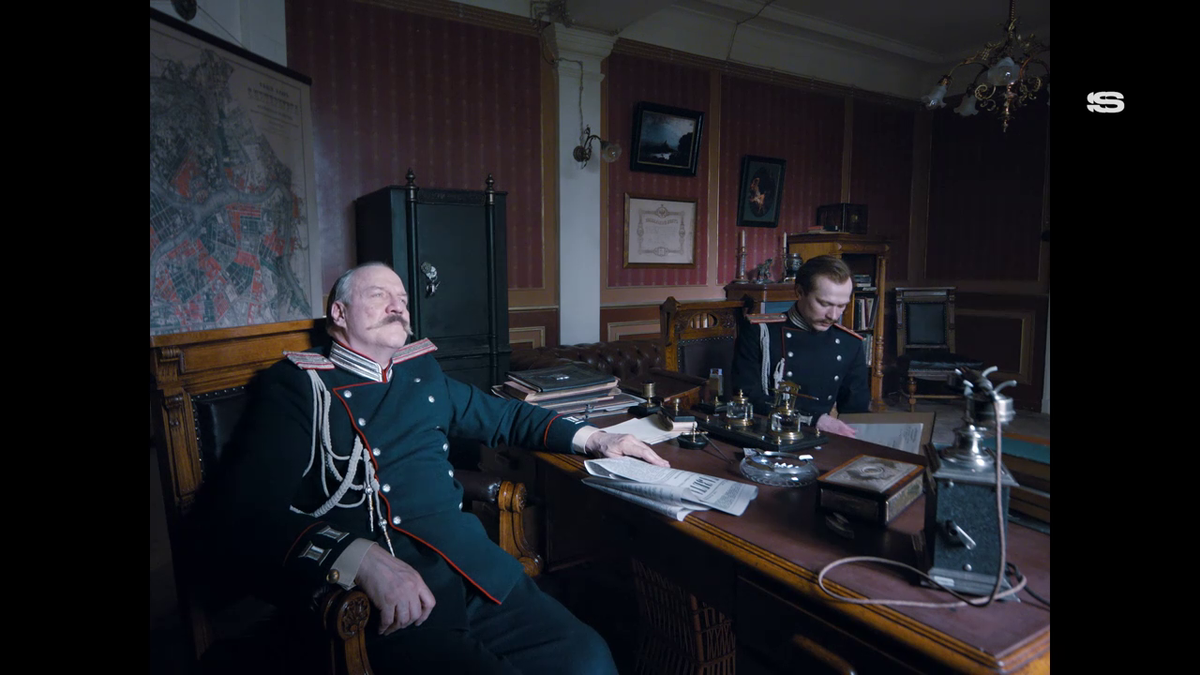 Но почему-то наш Миша идёт на доклад к некоему полковнику Курловскому. который в титрах кадра обозначен как начальник охранки. Ладно, охранка и охранка, какая неважно, хотя Охранных отдлений, этих специальных оперативно-розыскных подразделений политического сыска, было тогда по стране 25.