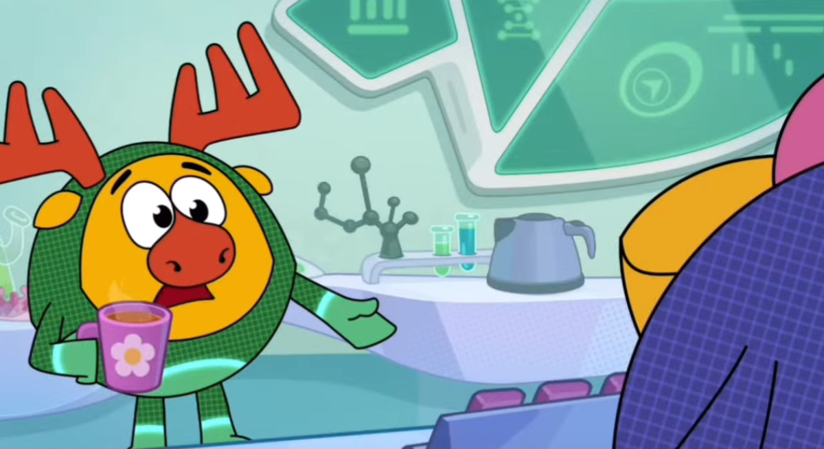 Что-то похожее было с серией "Ух ты, Лахта!". Ладно уж, досмотрим эту рекламу... Отвлекают Лосяша от работы звуки с палубы выше: там Крош и Ёжик играют в футбол в VR-очках. Учёного невероятно раздражает, что эти двое смеют играть на Пинолёте в такие игры.