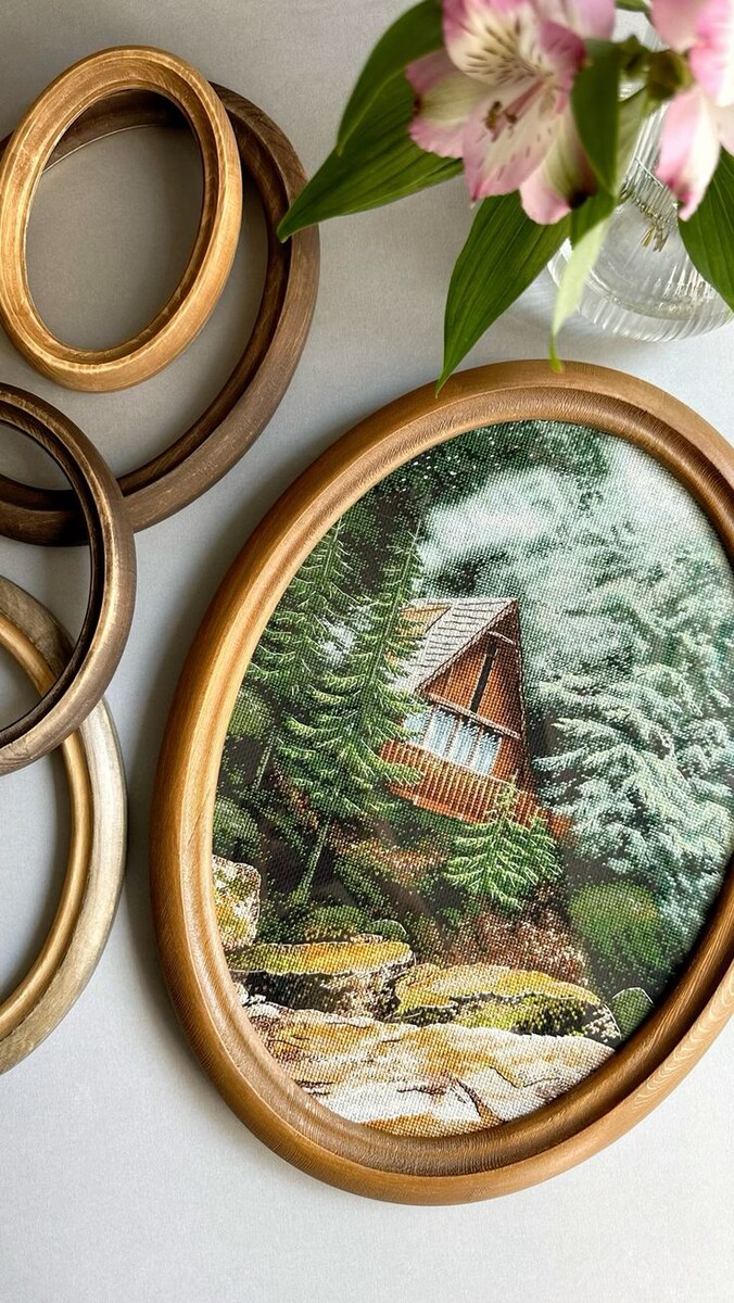 Можно выбрать деревянную рамку (для уютных сюжетов), белую или металлическую (для минимализма), или даже обтянуть паспарту тканью в тон вышивки.