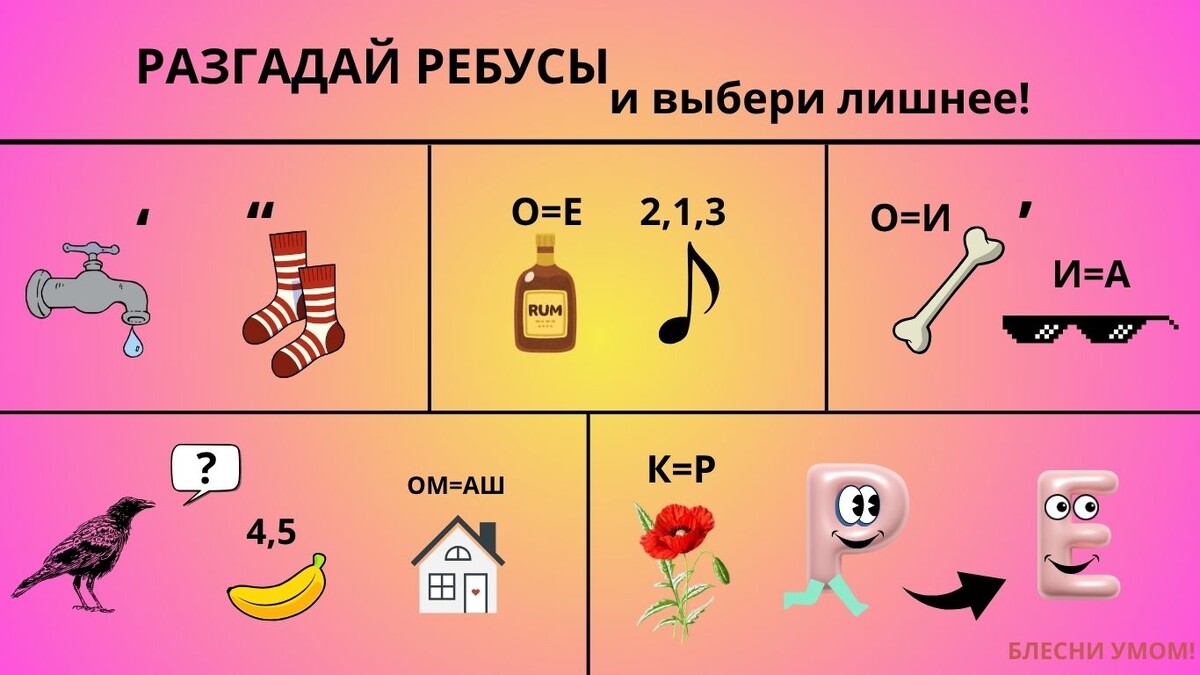 Это настоящий тренажёр для ума, который объединяет визуальное мышление, логику и языковую интуицию. Предлагаю вам два типа заданий: разгадывание ребусов и поиск лишнего слова. Оба формата — это не только весело, но и полезно: они активируют разные участки мозга, улучшают концентрацию и развивают креативность.