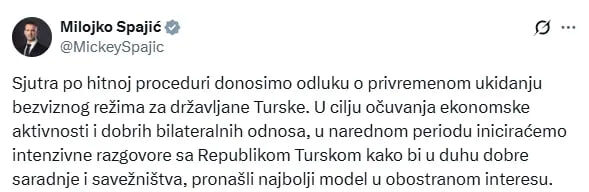 ❗️ Международный скандал: Черногория временно отменяет безвиз для граждан Турции Черногория временно приостанавливает право турок посещать страну без визы. Причина - инцидент, произошедший 26 октября в столице Подгорице: - В ходе драки житель Подгорицы, защищавший женщину, получил ножевые ранения. - Полиция задержала двух граждан Турции, подозреваемых в нападении. - В районе происшествия начались массовые протесты с антимигрантскими лозунгами. - Позднее задержаны ещё 45 турецких граждан за различные нарушения. Премьер-министр Спажич в своем заявлении в X сообщил: "Мы примем решение о временной приостановке безвизового режима для граждан Турции через необходимую процедуру. С целью защиты экономической деятельности и хороших двусторонних отношений, в ближайшие дни мы начнем интенсивные переговоры с Республикой Турция, чтобы найти наиболее подходящую модель, которая будет в интересах обеих сторон в духе хорошего сотрудничества и альянса." Подписывайтесь на наш канал LifeinTurkeyRestPro