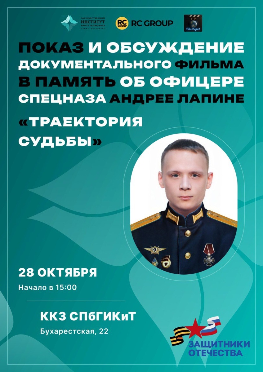 📢28 октября в 15:00 в ККЗ ГИКИТ состоится показ документальной картины "Траектория судьбы". Главный герой - офицер 24-й отдельной гвардейской бригады спецназа Андрей Лапин. Закончил школу в Тосно в 2015 году, а затем – Санкт-Петербургское военное училище по специальности военный переводчик. Добровольцем ушёл на СВО и 13 августа 2022 года погиб, исполняя воинский долг. Режиссер картины – Сергей Гарусов, актер, каскадер, создатель документальных фильмов патриотической направленности. Картина снята при поддержке фонда «Защитники Отечества». На мероприятии будет присутствовать режиссер картины, родители и сослуживцы Андрея. Зрители смогут задать им вопросы о жизни героя и работе над картиной. Приглашаем всех! 📌Когда: 28 октября, 15:00 📌Где: Бухарестская 22, Киноконцертный зал ГИКИТ