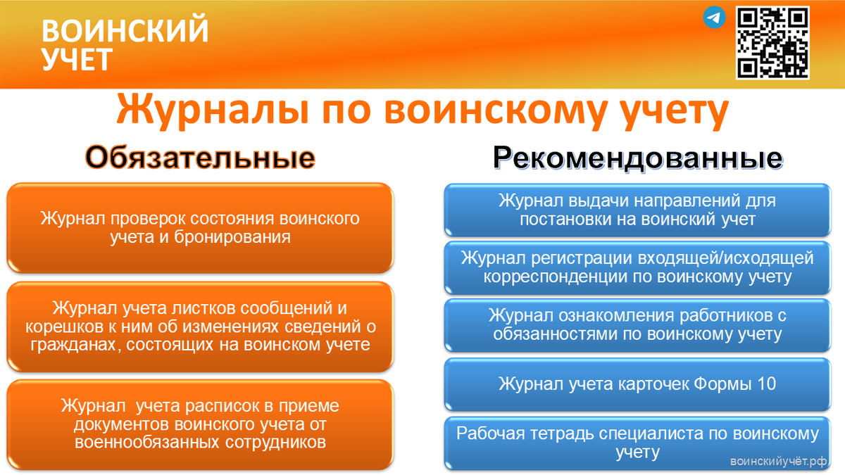 Каждый новый календарный год я начинаю с нового, в том числе и с журналов. Полная статья в Телеграм-канале "Воинский учет РФ" Журналы "делю" на две категории: 📕Обязательные журналы. Ведутся в бумажном виде. Их только три. Три журнала, которые упоминаются в действующем законодательстве. 1️⃣ Журнал проверок состояния воинского учёта и бронирования. Всегда требуется ВК при ежегодных сверках и проверках. Используется для фиксации сверок/проверок и их результатов, по сути, является одним из самых важных для специалиста по воинскому учёту. Форма журнала установлена приложением 18 к МР2017 года. 2️⃣ Журнал учёта листков сообщений и корешков к ним об изменениях сведений о гражданах, состоящих на воинском учете. Нужен для регистрации выдачи листков сообщения военнообязанным сотрудникам при изменении их данных, потому что листок сообщения выдается полностью. Хотя форма журнала не установлена, его наличие обязательно. Упоминается в Приложении № 13 к МР2017 года. 3️⃣ Журнал учёта расписок в п